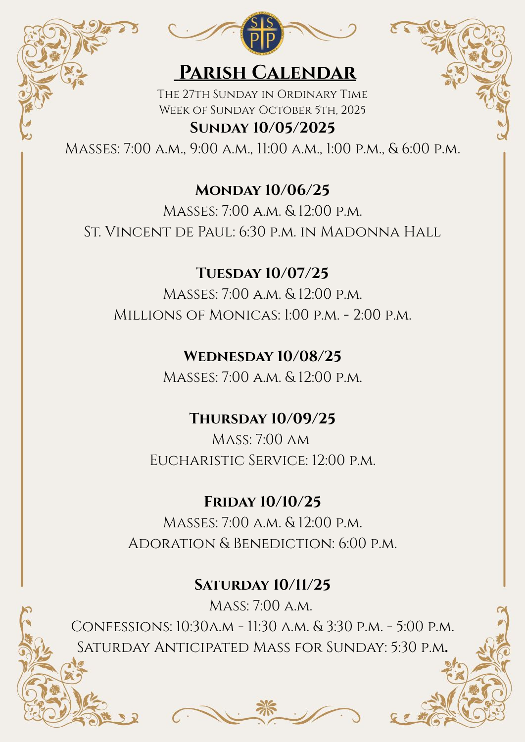 Our annual Rosary Procession is on Sunday, October 19th, immediately following the 7 am mass. Coffee, donuts, and fellowship to follow in